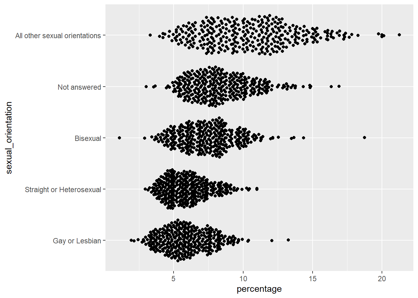 ungroup()By default in R, categories are sorted alphabetically unless you specify otherwise. Although there are times when an alphabetical ordering of categories on a chart is appropriate, it’s not really going to make sense here. Instead, we’ll sort the sexual orientation categories from highest to lowest median percentage. Let’s calculate the median for each group: