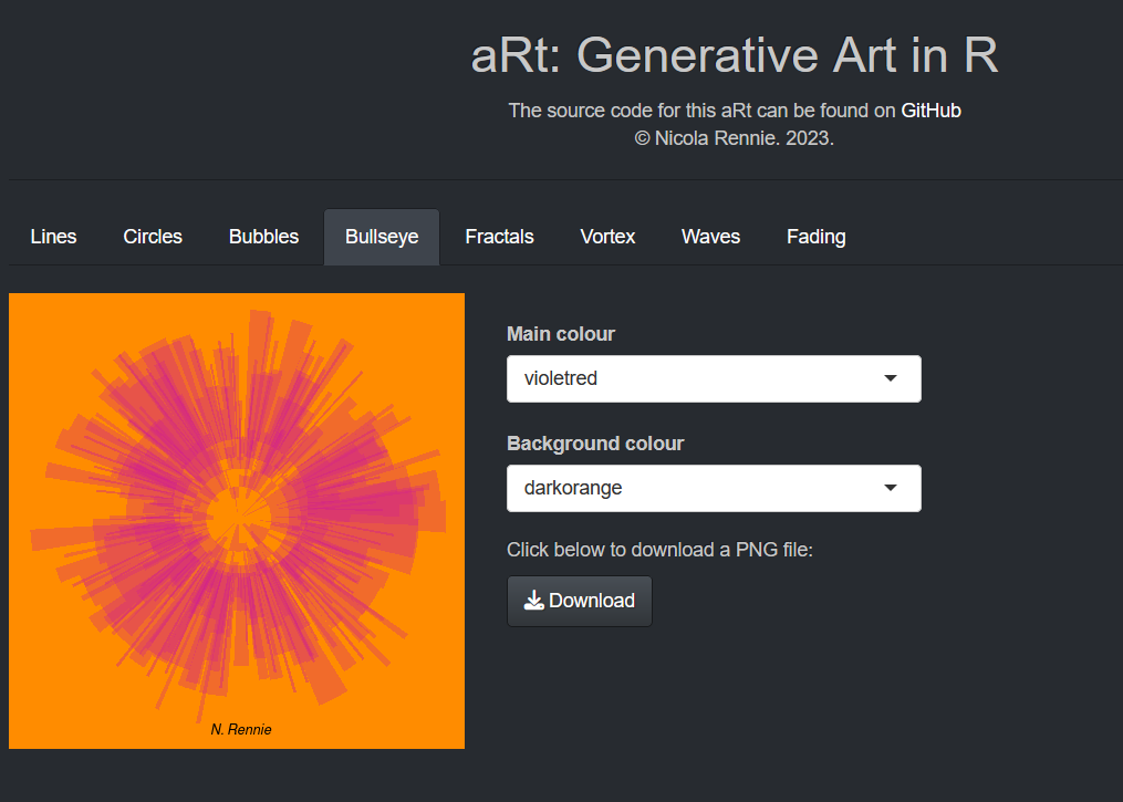 An application to generate and download generative art created in R. The app allows people to choose a piece of generative art, set colours and other parameters, then click a button to download a PNG file of the art.