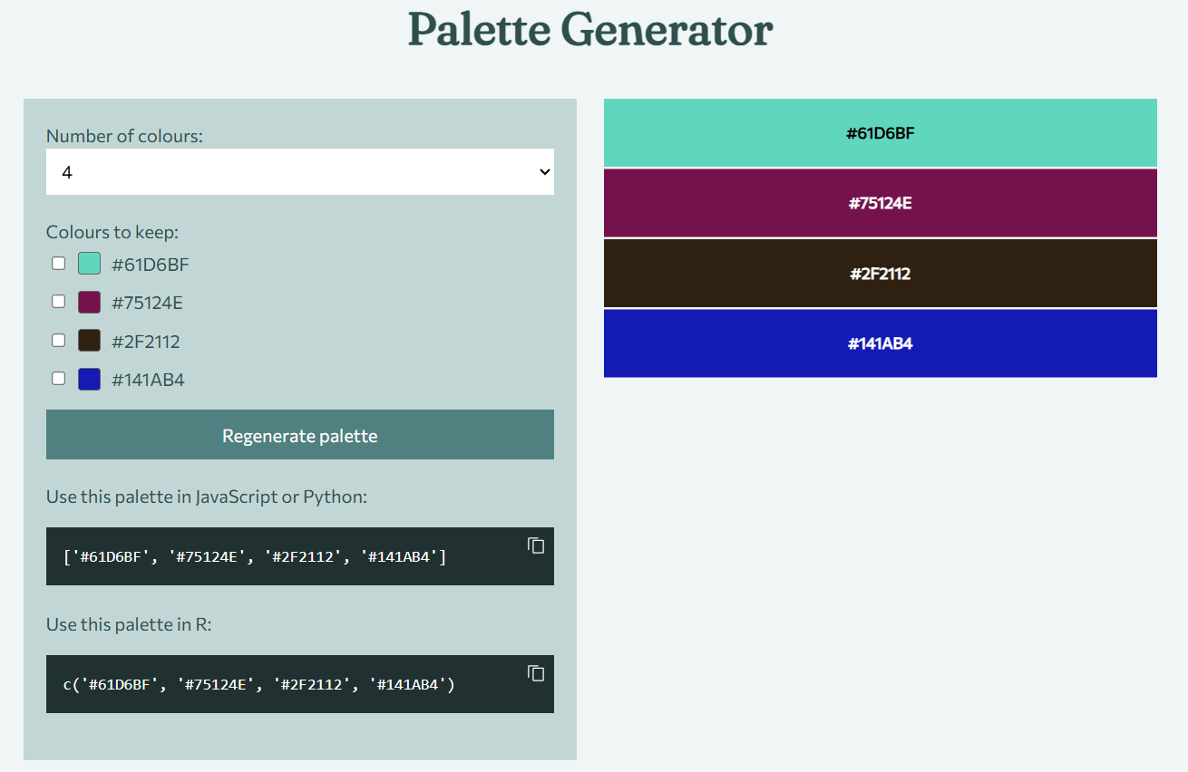 An app that generates random colour palettes with up to 12 colours, with users able to choose which colours remain in the next palette generation. Code to use the palettes in R and Python is generated alongside the palettes.