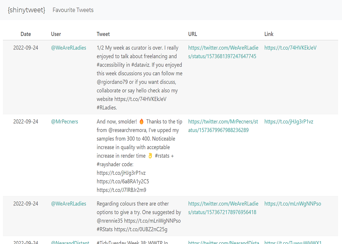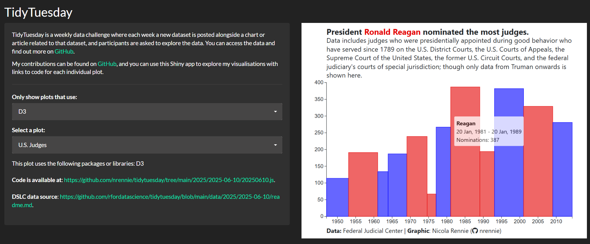 An app that displays every TidyTuesday plot I’ve created, with functionality to search by packages used in creating the plots and links to the original code and data, that updates by itself whenever I create a new plot. This app is deployed using Shinylive for R, meaning it runs in the user’s web browser and does not require an R server. Read my blog post describing the process of building and deploying this Shiny app.
