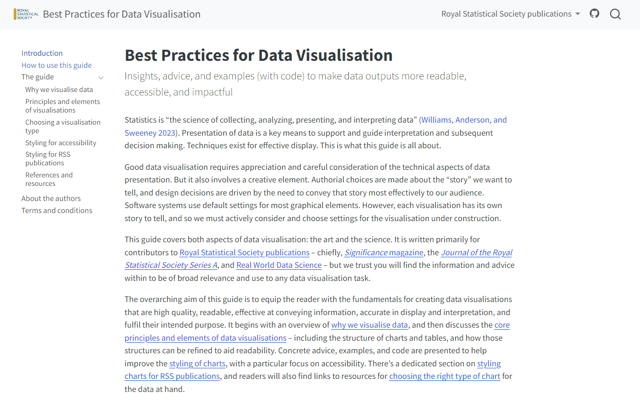 Alongside Andreas Krause (Idorsia Pharmaceuticals) and Brian Tarran (Royal Statistical Society), I co-authored the Royal Statistical Society’s Best Practices for Data Visualisation guidance, published in July 2023. The guide covers both the art and the science of data visualisation. It is written primarily for contributors to Royal Statistical Society publications – chiefly, Significance magazine, the Journal of the Royal Statistical Society Series A, and Real World Data Science – but the information and advice within is of broad relevance and use to any data visualisation task. The guide can be viewed at rss.org.uk/datavisguide.